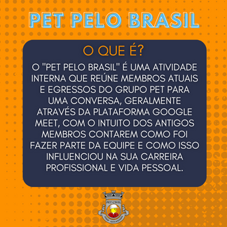 Hoje vamos apresentar uma das atividades internas do grupo, o "PET pelo Brasil". Nessa atividade, membros egressos que já estão no mercado de trabalho contam um pouco das suas experiências para os atuais membros do grupo.