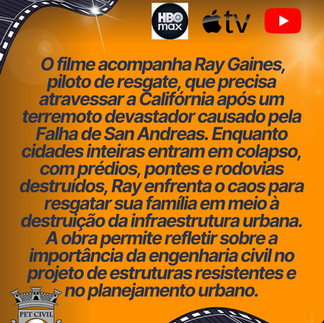 O filme retrata um grande terremoto causado pela Falha de San Andreas, evidenciando os impactos dos sismos sobre cidades, pontes e edificações. Mesmo com exageros cinematográficos, a obra permite refletir sobre a importância da engenharia civil no projeto de estruturas resistentes, no planejamento urbano e na redução de riscos em áreas sujeitas a desastres naturais 🏗️